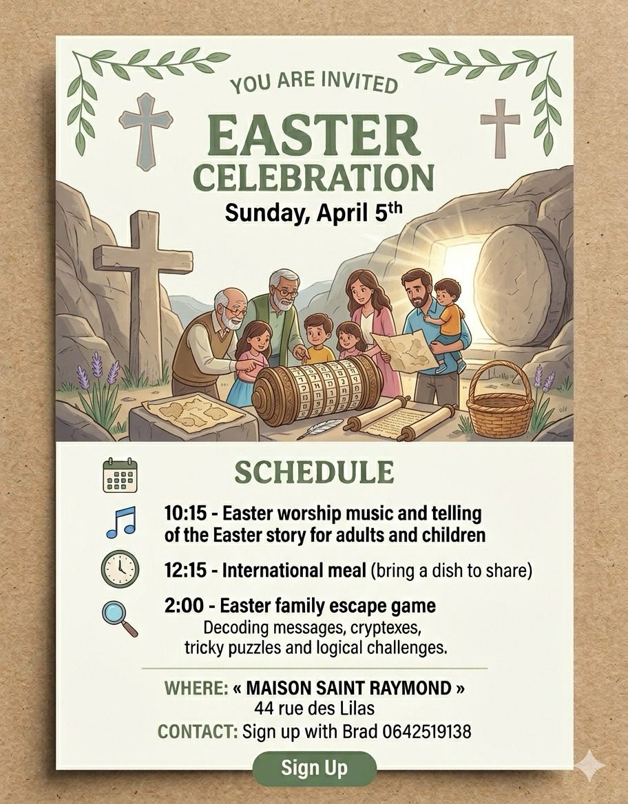 Dear all, it will soon be Easter. What a wonderful time to celebrate together! And what a wonderful time to share the Good News of Jesus death and resurrection with our friends. On Easter Sunday, April 5th, we will have a fellowship meal together after the service, and we will enjoy Easter family escape game. Please plan to attend and please invite a friend.